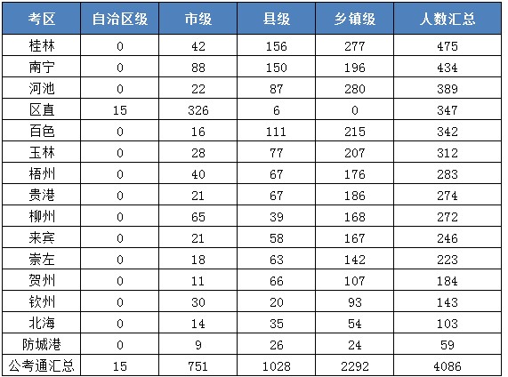 本次考试招录计划覆盖广西各个地(市),桂林以招录475人,248个职位夺得今年广西公务员考试招录冠军,而南宁招录434人210个职位紧随其后。各考区中只有这两者招录人数超过400人。而防城港今年仅有35个职位招录59人,想要该地区上岸的考生,可能会难上加难。